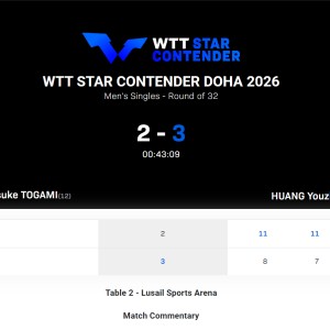 北京时间1月17日凌晨,WTT多哈球星挑战赛男单1/16决赛,国乒20岁小将黄友政3-2逆转日乒名将户上隼辅,五局比分:...