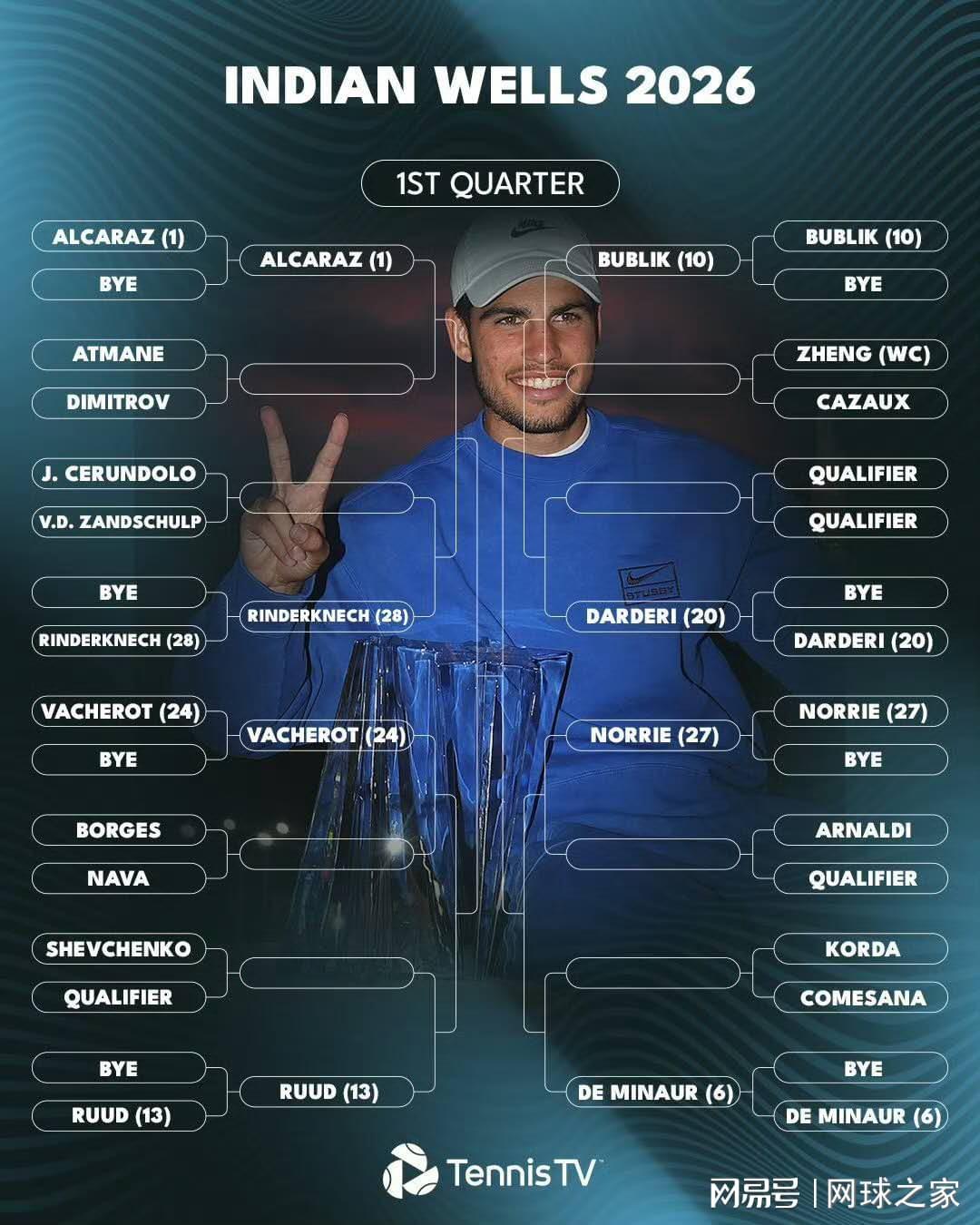 尽管中东地区的战事导致依旧有一部分球员滞留在该地,但不妨碍本周即将揭幕的印第安韦尔斯这站全年首项大师赛的正常进行。日前,赛事方也公布了赛事签表,让我们看看男单的情况。